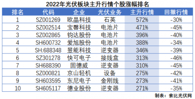 個股方面,次新、電池片以及逆變器漲幅居前。其中,年內(nèi)上市的“石英坩堝第一股”歐晶科技、微逆龍頭昱能科技、接線盒翹楚快可電子漲幅分別達到572%、346%和313%;跨界HJT和TOPCon的寶馨科技和鈞達股份漲幅分別達到471%和396%,主打ABC電池技術路線的愛旭股份漲幅達到388%;光儲逆變器頭部廠商固德威和德業(yè)股份漲幅分別達到310%和271%。