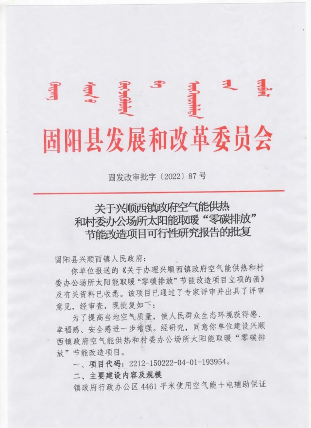 《固陽(yáng)縣興順西鎮(zhèn)政府空氣能供熱和村委辦公場(chǎng)所太陽(yáng)能取暖“零碳排放”節(jié)能改造項(xiàng)目批復(fù)公示》
