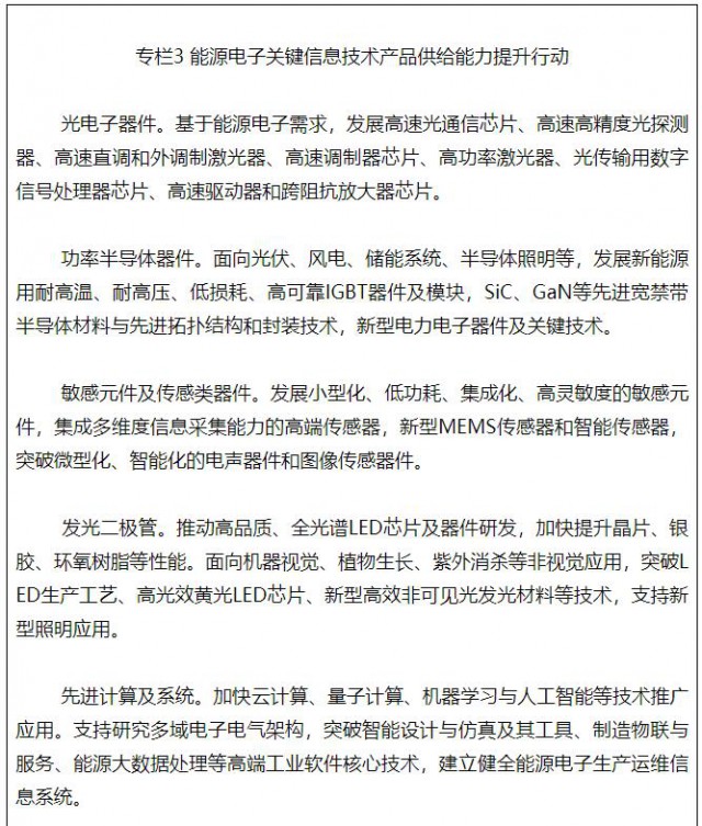 加強(qiáng)面向新能源領(lǐng)域的關(guān)鍵信息技術(shù)產(chǎn)品開發(fā)和應(yīng)用,主要包括適應(yīng)新能源需求的電力電子、柔性電子、傳感物聯(lián)、智慧能源信息系統(tǒng)及有關(guān)的先進(jìn)計算、工業(yè)軟件、傳輸通信、工業(yè)機(jī)器人等適配性技術(shù)及產(chǎn)品。研究小型化、高性能、高效率、高可靠的功率半導(dǎo)體、傳感類器件、光電子器件等基礎(chǔ)電子元器件及專用設(shè)備、先進(jìn)工藝,支持特高壓等新能源供給消納體系建設(shè)。推動能源電子產(chǎn)業(yè)數(shù)字化、智能化發(fā)展,突破全環(huán)境仿真平臺、先進(jìn)算力算法、工業(yè)基礎(chǔ)軟件、人工智能等技術(shù)。推動信息技術(shù)相關(guān)裝備及儀器創(chuàng)新發(fā)展。