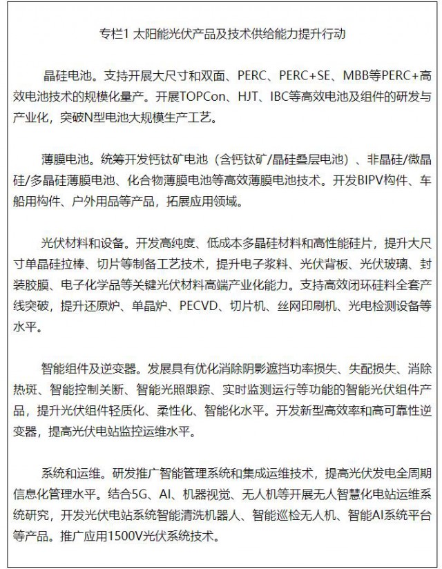加快智能光伏創(chuàng)新突破,發(fā)展高純硅料、大尺寸硅片技術(shù),支持高效低成本晶硅電池生產(chǎn),推動N型高效電池、柔性薄膜電池、鈣鈦礦及疊層電池等先進(jìn)技術(shù)的研發(fā)應(yīng)用,提升規(guī)?;慨a(chǎn)能力。鼓勵開發(fā)先進(jìn)適用的智能光伏組件,發(fā)展智能逆變器、控制器、匯流箱、跟蹤系統(tǒng)等關(guān)鍵部件。加大對關(guān)鍵技術(shù)裝備、原輔料研發(fā)應(yīng)用的支持力度。鼓勵開發(fā)安全便捷的戶用智能光伏系統(tǒng),鼓勵發(fā)展光伏充電寶、穿戴裝備、交通工具等移動能源產(chǎn)品。探索建立光伏“碳足跡”評價標(biāo)準(zhǔn)并開展認(rèn)證。加快構(gòu)建光伏供應(yīng)鏈溯源體系,推動光伏組件回收利用技術(shù)研發(fā)及產(chǎn)業(yè)化應(yīng)用。