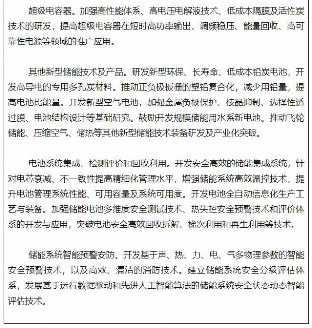 加強(qiáng)新型儲能電池產(chǎn)業(yè)化技術(shù)攻關(guān),推進(jìn)先進(jìn)儲能技術(shù)及產(chǎn)品規(guī)?;瘧?yīng)用。研究突破超長壽命高安全性電池體系、大規(guī)模大容量高效儲能、交通工具移動儲能等關(guān)鍵技術(shù),加快研發(fā)固態(tài)電池、鈉離子電池、氫儲能/燃料電池等新型電池。推廣智能化生產(chǎn)工藝與裝備、先進(jìn)集成及制造技術(shù)、性能測試和評估技術(shù)。提高鋰、鎳、鈷、鉑等關(guān)鍵資源保障能力,加強(qiáng)替代材料的開發(fā)應(yīng)用。推廣基于優(yōu)勢互補(bǔ)功率型和能量型電化學(xué)儲能技術(shù)的混合儲能系統(tǒng)。支持建立鋰電等全生命周期溯源管理平臺,開展電池碳足跡核算標(biāo)準(zhǔn)與方法研究,探索建立電池產(chǎn)品碳排放管理體系。