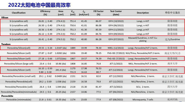 2022太陽電池中國最高效率發(fā)布,隆基綠能共有7個電池效率入選,占此次效率結(jié)果發(fā)布的近1/2。