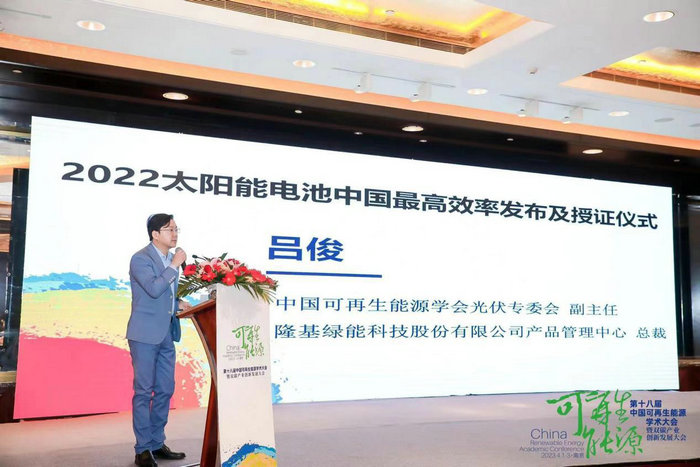 中國可再生能源學會光伏專委會副主任、隆基綠能產(chǎn)品管理中心總裁呂俊博士進行《2022太陽電池中國最高效率》發(fā)布。
