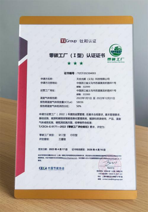2023年4月11日~12日,零碳工廠授權(quán)評價機構(gòu)--鈦和認證依據(jù)《零碳工廠評價規(guī)范》,從合規(guī)要求、管理要求、基礎(chǔ)設(shè)施、能源和碳排放智能信息化管理系統(tǒng)、能源和資源使用、產(chǎn)品生態(tài)設(shè)計、溫室氣體減排實施、碳抵消實施八項一級指標對義烏基地進行了詳細的評估和審核,義烏基地最終獲得了綜合評分79.68(該等級滿分為80分)的高分,自主減排后完成了對直接溫室氣體排放和輸入能源間接溫室氣體排放抵消50%,成功獲得了由鈦和認證集團頒發(fā)的2022年度的零碳工廠證書,成為太陽能行業(yè)首位獲第三方授權(quán)評價機構(gòu)認證的零碳工廠企業(yè)。