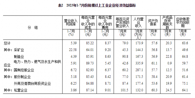 7月末,規(guī)模以上工業(yè)企業(yè)每百元資產(chǎn)實現(xiàn)的營業(yè)收入為79.0元,同比減少6.2元;人均營業(yè)收入為173.9萬元,同比增加4.9萬元;產(chǎn)成品存貨周轉(zhuǎn)天數(shù)為20.3天,同比增加1.1天;應(yīng)收賬款平均回收期為63.6天,同比增加6.3天。