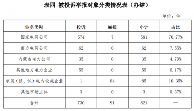 供電企業(yè)1158件、占投訴舉報總數的87.99%,其中國家電網公司906件、占投訴舉報總數的68.85%,南方電網公司127件、占投訴舉報總數的9.65%,內蒙古電力公司48件、占投訴舉報總數的3.65%,其他地方電力企業(yè)77件、占投訴舉報總數的5.84%;承裝(修、試)電力設施企業(yè)157件、占投訴舉報總數的11.93%;其他市場主體1件、占投訴舉報總數的0.08%。