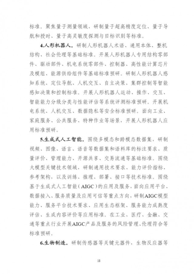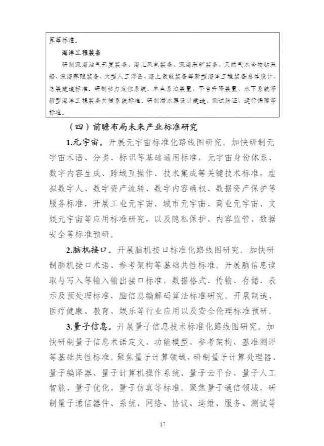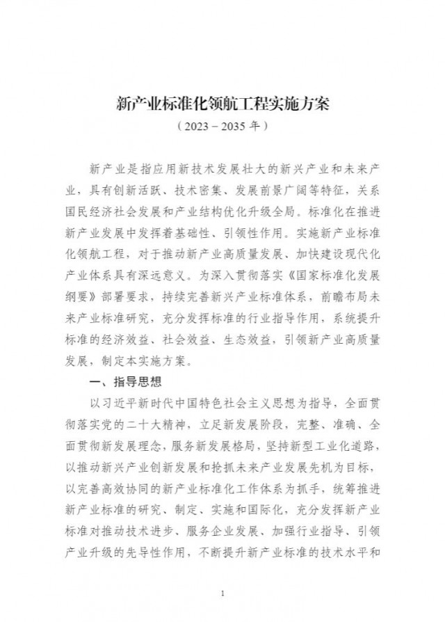 為貫徹落實(shí)《國家標(biāo)準(zhǔn)化發(fā)展綱要》,持續(xù)完善新興產(chǎn)業(yè)標(biāo)準(zhǔn)體系建設(shè),前瞻布局未來產(chǎn)業(yè)標(biāo)準(zhǔn)研究,充分發(fā)揮標(biāo)準(zhǔn)的行業(yè)指導(dǎo)作用,引領(lǐng)新產(chǎn)業(yè)高質(zhì)量發(fā)展,工業(yè)和信息化部、科技部、國家能源局、國家標(biāo)準(zhǔn)化管理委員會組織編制了《新產(chǎn)業(yè)標(biāo)準(zhǔn)化領(lǐng)航工程實(shí)施方案(2023─2035年)》。現(xiàn)印發(fā)你們,請結(jié)合本地區(qū)、本行業(yè)實(shí)際,抓好貫徹落實(shí)。