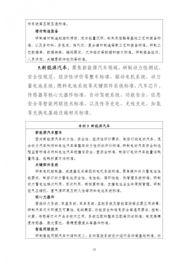 《方案》明確,在新能源汽車方面,聚焦新能源汽車領(lǐng)域,研制動力性測試、安全性規(guī)范、經(jīng)濟(jì)性評價(jià)等整車標(biāo)準(zhǔn),驅(qū)動電機(jī)系統(tǒng)、動力蓄電池系統(tǒng)、燃料電池系統(tǒng)等關(guān)鍵部件系統(tǒng)標(biāo)準(zhǔn),汽車芯片、傳感器等核心元器件標(biāo)準(zhǔn),自動駕駛系統(tǒng)、功能安全、信息安全等智能網(wǎng)聯(lián)技術(shù)標(biāo)準(zhǔn),以及傳導(dǎo)充電、無線充電、加氫等充換電基礎(chǔ)設(shè)施相關(guān)標(biāo)準(zhǔn)。