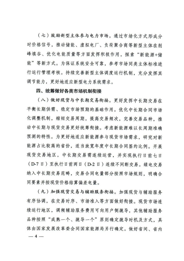 加強(qiáng)現(xiàn)貨交易與輔助服務(wù)銜接。加強(qiáng)現(xiàn)貨與輔助服務(wù)有序協(xié)調(diào),在交易時(shí)序、市場(chǎng)準(zhǔn)入等方面做好銜接?,F(xiàn)貨市場(chǎng)連續(xù)運(yùn)行地區(qū),調(diào)頻輔助服務(wù)費(fèi)用可向用戶側(cè)疏導(dǎo),其他輔助服務(wù)品種按照“成熟一個(gè)、疏導(dǎo)一個(gè)”原則確定疏導(dǎo)時(shí)機(jī)及方式,具體由國(guó)家發(fā)展改革委會(huì)同國(guó)家能源局另行確定。做好省間、省內(nèi)現(xiàn)貨市場(chǎng)與區(qū)域輔助服務(wù)市場(chǎng)的銜接融合,提升電力資源優(yōu)化配置效率。