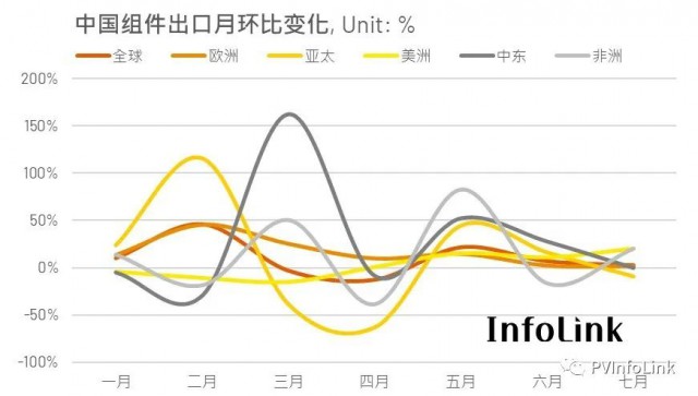 中國組件出口持續(xù)成長,若各月和去年同期比較,同比成長都有接近甚至超過一倍以上的漲幅,但是觀察每月的環(huán)比成長可以發(fā)現(xiàn)中國組件的出口成長可能已開始趨緩。從五月開始,每月的出口環(huán)比成長逐漸萎縮,七月的環(huán)比成長剩下3%,代表中國的組件單月出口量已接近今年高峰值。