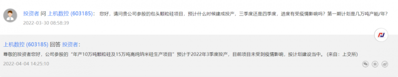 上機(jī)數(shù)控(603185.SH)4月4日在投資者互動(dòng)平臺(tái)表示,公司參股的“年產(chǎn)10萬(wàn)噸顆粒硅及15萬(wàn)噸高純納米硅生產(chǎn)項(xiàng)目”預(yù)計(jì)于2022年3季度投產(chǎn),目前項(xiàng)目未受到疫情影響,按計(jì)劃建設(shè)當(dāng)中。