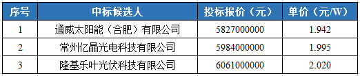 就在不久前,在華潤電力近期的3GW組件組件招標(biāo)中,,硅料、電池片龍頭——通威股份,以1.942元/W的價格,成為第一中標(biāo)候選人!比第二、第三中標(biāo)候選人的價格,低0.055元/W以上!