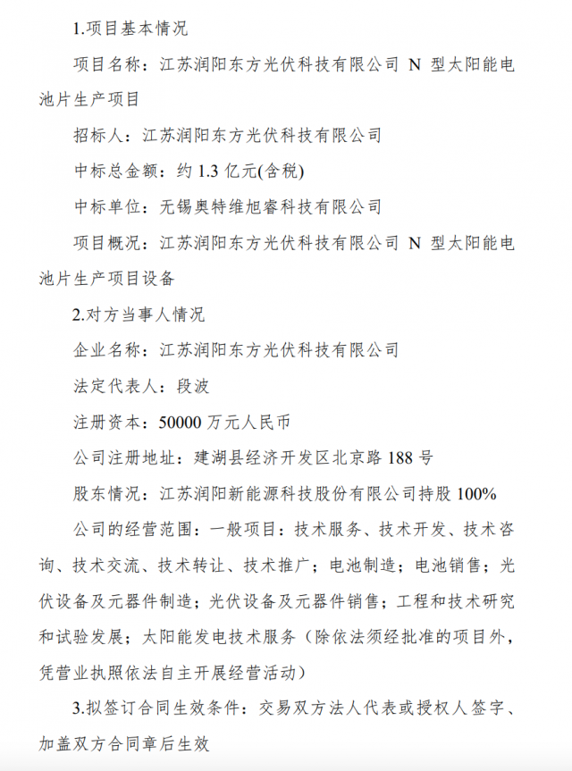 奧特維公司控股子公司中標(biāo)潤陽東方光伏科技N型電池片生產(chǎn)項目,中標(biāo)金額約1.3億元。