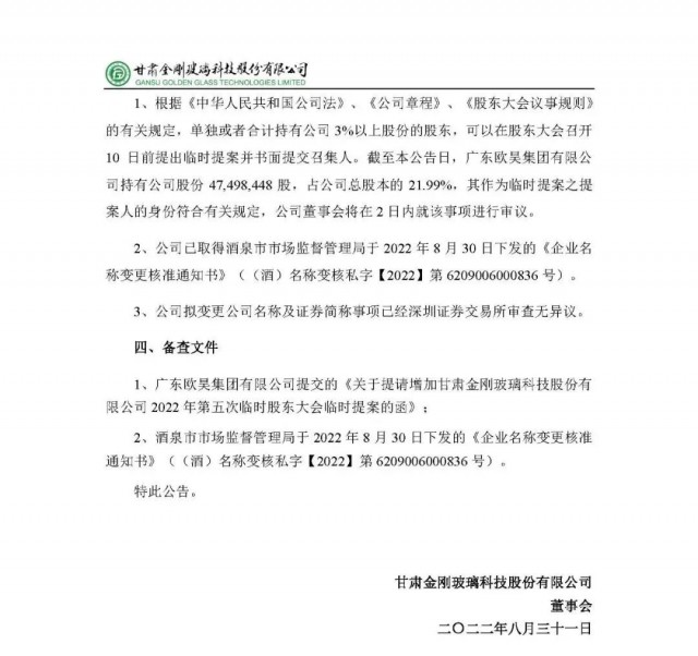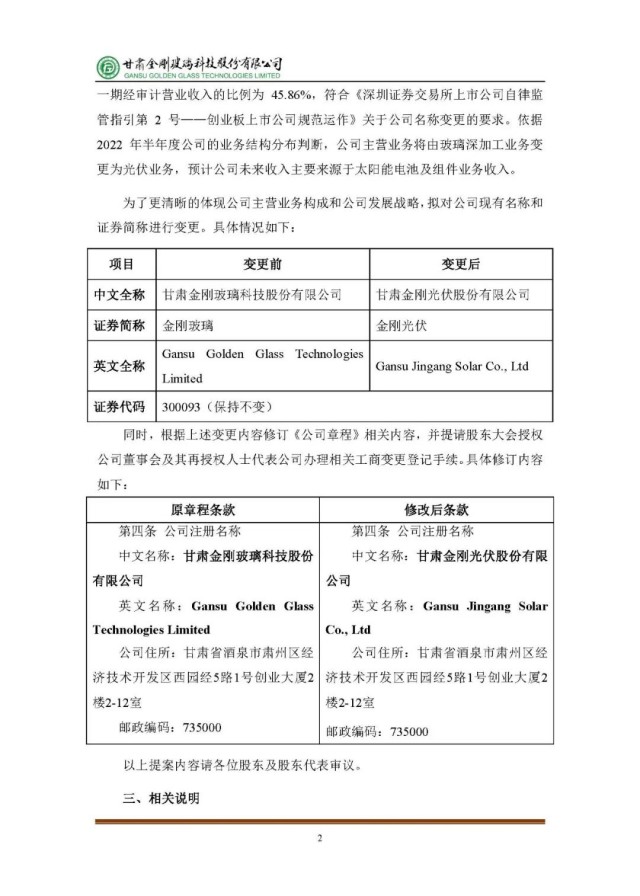 為了更清晰的體現(xiàn)公司主營(yíng)業(yè)務(wù)構(gòu)成和公司發(fā)展戰(zhàn)略,擬對(duì)公司現(xiàn)有名稱(chēng)和證券簡(jiǎn)稱(chēng)進(jìn)行變更。上市公司名稱(chēng)由“甘肅金剛玻璃科技股份有限公司”變更為“甘肅金剛光伏股份有限公司”,證券簡(jiǎn)稱(chēng)由“金剛玻璃”改為“金剛光伏”,英文全稱(chēng)由“Gansu Golden Glass Technologies Limited”改為“Gansu Jingang Solar Co., Ltd”。公司董事會(huì)將在兩日內(nèi)就該事項(xiàng)進(jìn)行審議。
