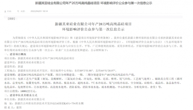 根據(jù)該項(xiàng)目此前公示的第一次環(huán)評顯示,項(xiàng)目建設(shè)單位為其亞鋁業(yè)集團(tuán)子公司新疆其亞鋁電有限公司。工程位于新疆準(zhǔn)東經(jīng)濟(jì)技術(shù)開發(fā)區(qū)。建設(shè)規(guī)模為20萬噸高純晶硅生產(chǎn)裝置。項(xiàng)目分兩期建設(shè),一期、二期分別建設(shè)年產(chǎn)10萬噸高純晶硅生產(chǎn)線。