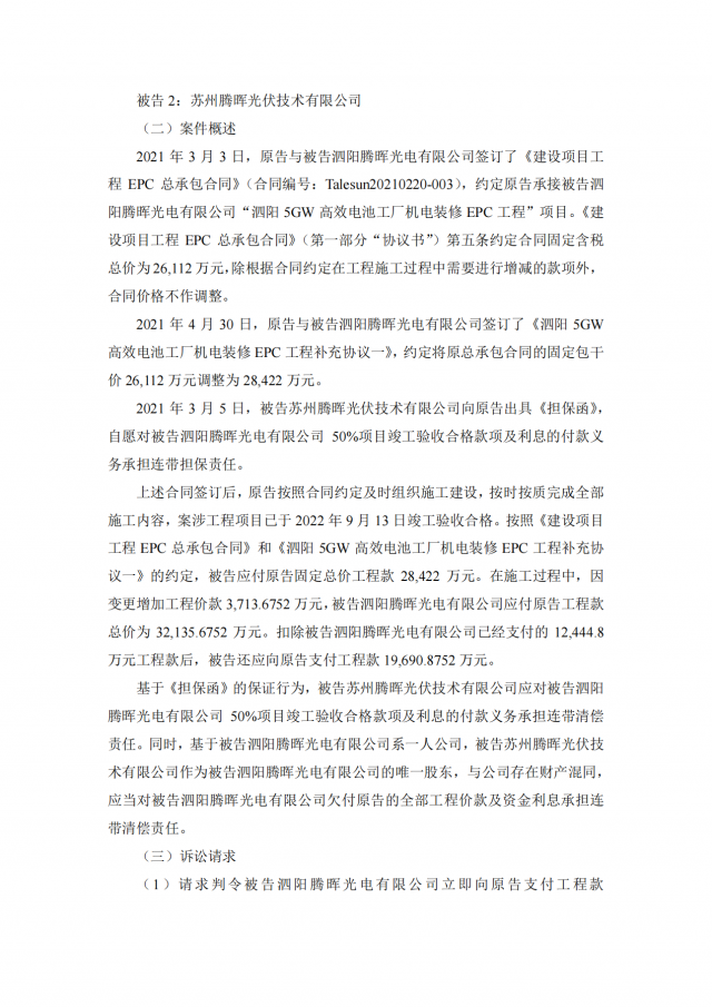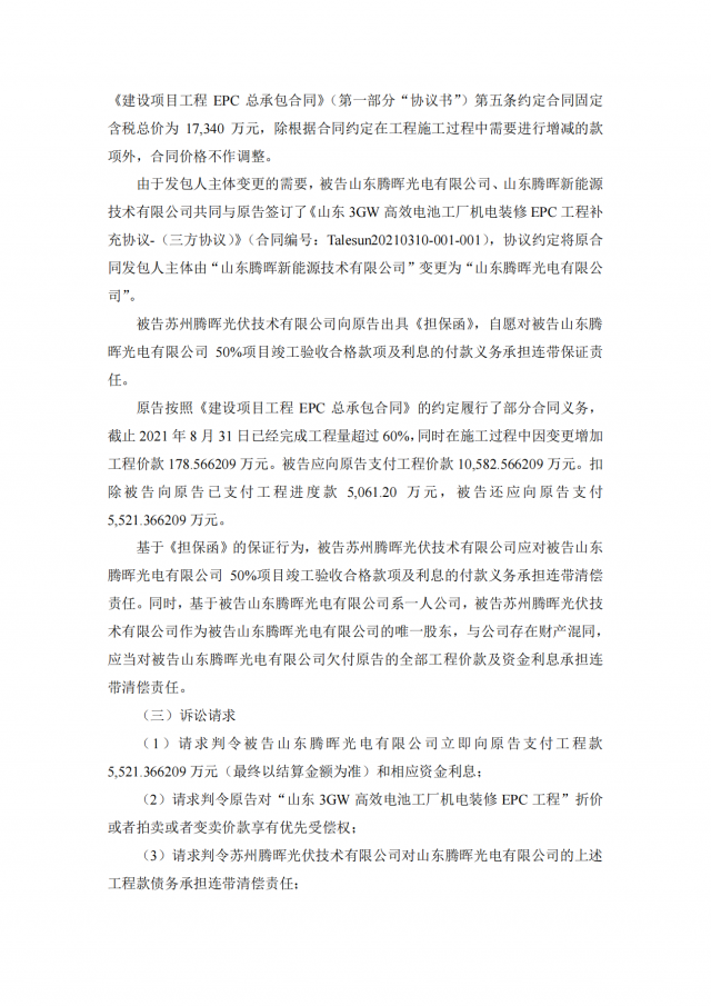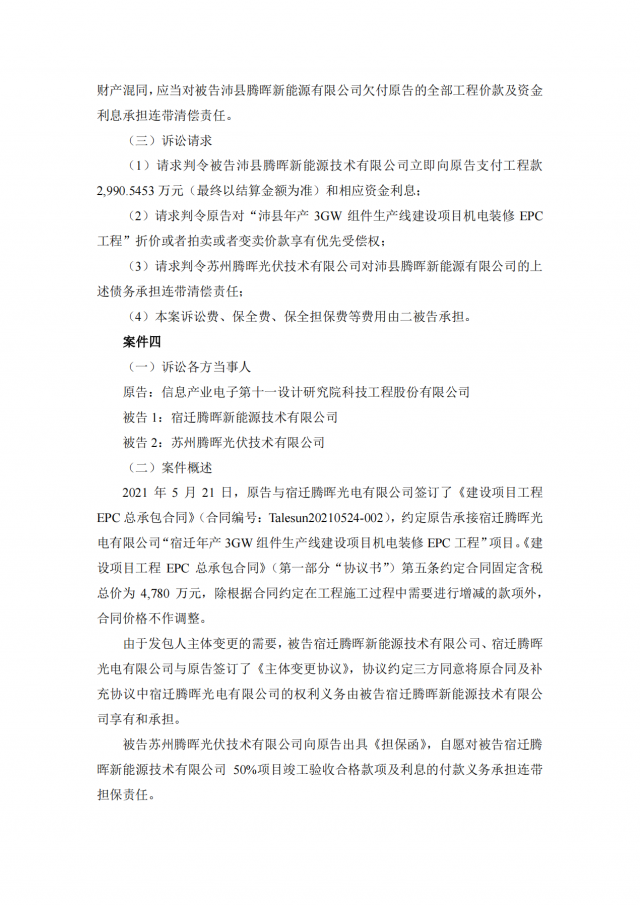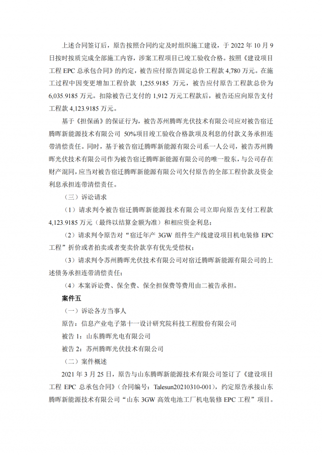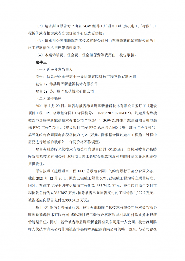 2020年~2021年期,十一科技與蘇州騰暉的六家全資子公司泗陽騰暉光電有限公司、山東騰暉新能源技術有限公司、沛縣騰暉新能源技術有限公司、宿遷騰暉新能源技術有限公司、山東騰暉光電有限公司、泗陽騰暉新能源技術有限公司簽訂了多筆項目施工承包合同,但上述六家企業(yè)并未全部付清工程款。