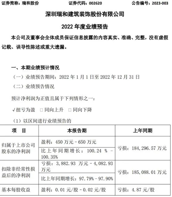 挖貝網(wǎng)1月29日,瑞和股份(002620)近日發(fā)布2022年年度業(yè)績預(yù)告,預(yù)計2022年歸屬于上市公司股東的凈利潤450萬元–650萬元,上年同期虧損184,296.57萬元,同比扭虧為盈。