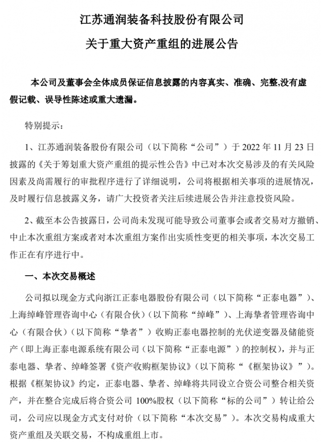 2022年11月23日,公司按照《深圳證券交易所上市公司自律監(jiān)管指引第8號(hào)—重大資產(chǎn)重組》規(guī)則要求披露了《江蘇通潤(rùn)裝備股份有限公司關(guān)于籌劃重大資產(chǎn)重組的提示性公告》。