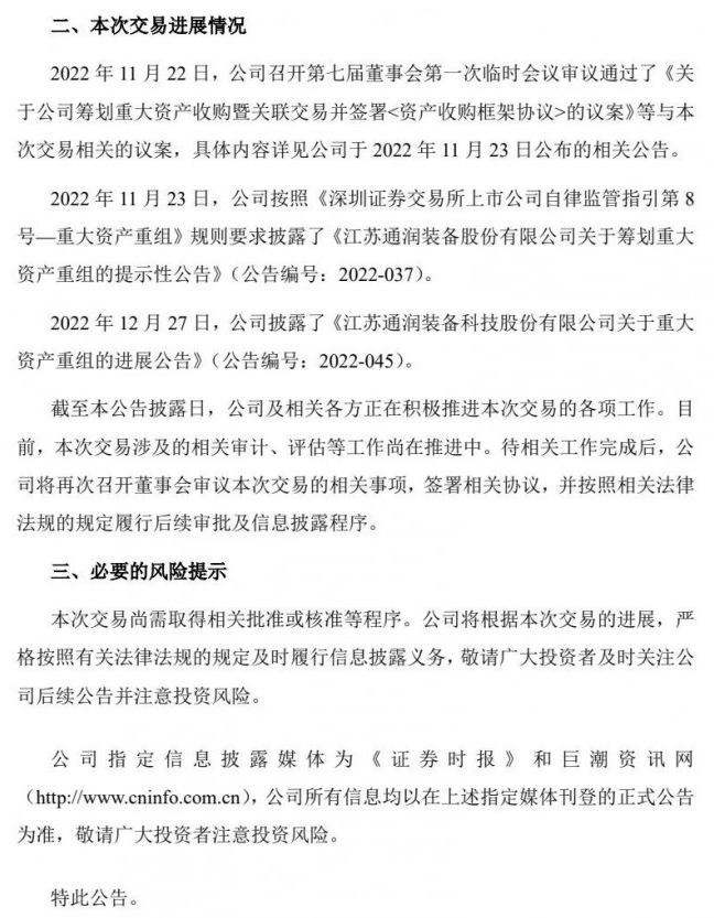 2022年12月27日,公司披露了《江蘇通潤(rùn)裝備科技股份有限公司關(guān)于重大資產(chǎn)重組的進(jìn)展公告》。截至本公告披露日,公司及相關(guān)各方正在積極推進(jìn)本次交易的各項(xiàng)工作。目前,本次交易涉及的相關(guān)審計(jì)、評(píng)估等工作尚在推進(jìn)中。待相關(guān)工作完成后,公司將再次召開(kāi)董事會(huì)審議本次交易的相關(guān)事項(xiàng),簽署相關(guān)協(xié)議,并按照相關(guān)法律法規(guī)的規(guī)定履行后續(xù)審批及信息披露程序。