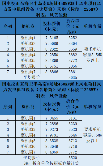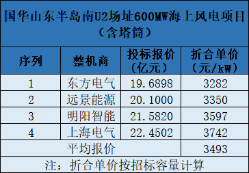 上次行業(yè)刷新低價是在國家能源集團國華投資山東半島南U2場址600MW海上風(fēng)機(含塔筒)采購項目。該項目共有4家整機商競標,其中東方電氣報價最低,投標報價為19.69億元,折合單價為3282元/kW。