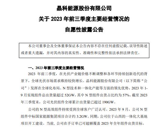 晶科能源公告稱,1-9月實(shí)現(xiàn)組件總出貨量超過52GW,其中N型組件出貨占比約為57%;截至2023年三季度末,公司光伏組件全球累計(jì)出貨量已超過190GW。