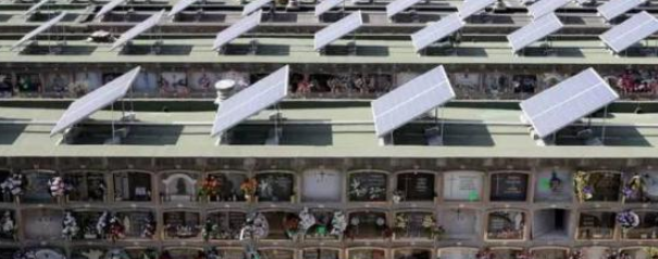 2008年,西班牙巴塞羅那附近小鎮(zhèn)桑塔克羅瑪將大量太陽能電池板安放到了一個(gè)“極少有人打攪的地方”——墓地。這個(gè)墓地的特別之處在于,462塊整齊劃一的太陽能電池板出現(xiàn)在墓地內(nèi)部,棺材一層層碼放起來,其中最高的“棺材樓”竟達(dá)到了五層,太陽能電池板就放在最高一層棺材上面。這些太陽能電池板生產(chǎn)的電能足夠滿足60戶居民的年需求,能讓該鎮(zhèn)一年減少向大氣中排放大約62噸二氧化碳。