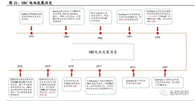 IBC 電池發(fā)展歷史:IBC 電池早最是由 Lammert 和 Schwartz 在 1975 年提出 的背面指交叉式電池結(jié)構(gòu)。美國(guó)的 Sunpower 公司是 IBC 電池的領(lǐng)軍者和開(kāi)拓者, 2014 年其量產(chǎn)平均效率就達(dá)到 23.62%,2015 年實(shí)驗(yàn)室效率達(dá)到 25.2%;2018 年 天合研發(fā)的大面積 IBC 電池轉(zhuǎn)換效率達(dá)到 25.04%;2019 年 5 月中來(lái)公司宣布已 經(jīng)可以實(shí)現(xiàn) IBC 電池的批量生產(chǎn),年產(chǎn)能約 150MW,量產(chǎn)轉(zhuǎn)換效率 22.8%,最高效率 23.4%。2020 年 5 月國(guó)電投黃河水電 200MW N 型 IBC 產(chǎn)線建設(shè)完成,量產(chǎn)平均轉(zhuǎn)換效率達(dá)到 23.6%。IBC 電池與其他新電池技術(shù)相疊加,可以獲得更高的 轉(zhuǎn)換效率,2017 年 3 月,日本 Kaneka 公司通過(guò)將 HJT 和 IBC 電池技術(shù)疊加,得 到 HBC 電池,效率達(dá)到 26.7%,目前這項(xiàng)效率記錄已經(jīng)保持 5 年之久。