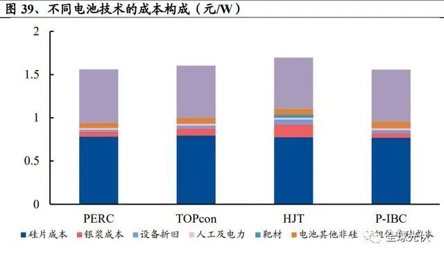 硅片端:硅片端成本差異主要來(lái)源于基地材料的選擇和硅片的厚度。硅片材料方面 TOPcon 和 HJT 使用 N 型硅片,PERC 和 P-IBC 使用 P 型硅片,硅片厚 度方面 TOPcon, PERC, P-IBC 均采用高溫工藝,使用厚度為 160μm 的硅片,HJT 低溫工藝可使用150μm硅片。N型硅片價(jià)格較P型高5-8%,則PERC,TOPcon, HJT,P-IBC 硅片端成本分別為 0.78、0.80、0.78、0.77 元/W。