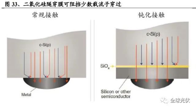 二氧化硅+摻雜多晶硅:隧穿作用和鈍化作用。二氧化硅隧穿膜最佳厚度在 1.2nm,其作用在于使多數(shù)載流子(電子)通過(guò)隧穿效應(yīng)穿過(guò)氧化層,但少數(shù)載流 子(空穴)被阻擋,從而進(jìn)一步降低了載流子復(fù)合效應(yīng)。摻雜多晶硅層一方面起到保護(hù)二氧化硅層的作用,另一方面會(huì)增加電子或空穴在氧化硅中的隧穿概率, 因此,多晶硅層的摻雜濃度越高,太陽(yáng)能電池的開(kāi)路電壓和效率就越高。