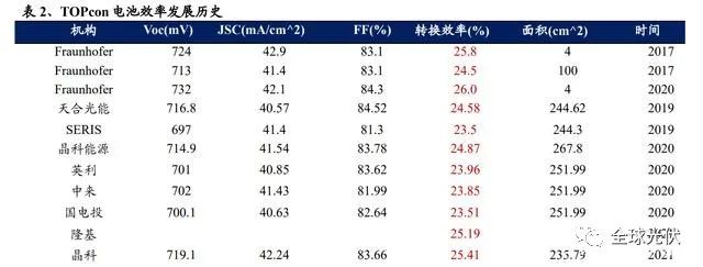 發(fā)展歷史:2013 年德國(guó) Fraunhofer 研究所在 N 型 PERT 結(jié)構(gòu)基礎(chǔ)上,首次提 出 TOPCon 結(jié)構(gòu);2017 年 Fraunhofer 研究所在實(shí)驗(yàn)室 TOPcon 電池上取得 25.8% 的效率記錄;2019 年,天合光能在面積為 244.62 平方厘米的 n 型襯底上制備出 正面最高效率為 24.58%的實(shí)驗(yàn)室電池,并獲德國(guó)哈梅林太陽(yáng)能研究所(ISFH) 下屬的檢測(cè)實(shí)驗(yàn)室認(rèn)證,同年,天合光能 i-TOPCon 雙面電池大規(guī)模量產(chǎn)正面平 均轉(zhuǎn)換效率突破 23%。2021 年,晶科能源 TOPcon 電池在權(quán)威第三方測(cè)試認(rèn)證機(jī) 構(gòu)日本 JET 檢測(cè)實(shí)驗(yàn)室標(biāo)定全面積電池最高轉(zhuǎn)化效率達(dá)到 25.4%,成為商業(yè)化全 面積電池效率記錄的保持者,為后續(xù)的 N 型 TOPCon 電池的擴(kuò)產(chǎn)奠定基礎(chǔ)。
