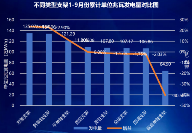 從支架實(shí)證數(shù)據(jù)分析,前三季度整體來(lái)看雙軸跟蹤系統(tǒng)發(fā)電量最高,斜單軸和平單軸次之,分別較固定支架發(fā)電量增益依次為23.83%、22.89%和11.2%;全維支架第一季度和第二季度由于支架跟蹤故障,正面輻照較低,7月份開始正常運(yùn)行后發(fā)電量明顯提高,第三季度發(fā)電量最高;另外,柔性支架總體發(fā)電量略低于固定支架,兩種柔性支架之間發(fā)電量一致性相對(duì)較差,累計(jì)發(fā)電量差1.8%。同時(shí),從實(shí)證出力曲線來(lái)看,跟蹤支架與固定支架、柔性支架相比功率曲線更加偏平,對(duì)電力系統(tǒng)更加友好。
