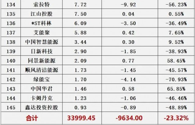 黑鷹團(tuán)隊(duì)統(tǒng)計(jì)發(fā)現(xiàn),相比2022年1月1日市值,截止12月23日(本周五)收盤,145家光伏上市公司總市值33999億元,若剔除十家上市不足一年的上市企業(yè),光伏總市值較年初下降了9634億元,“蒸發(fā)”近萬億,降幅達(dá)23.32%。
