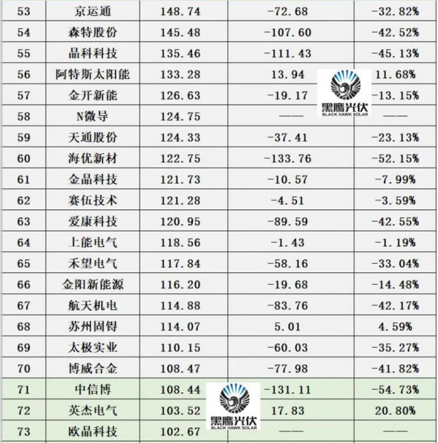 如下表,總市值排在前20的光伏企業(yè),其市值較今年1月1日,其中18家均出現(xiàn)不小幅度下跌。隆基綠能總市值減少1592億,通威股份減少313億,三峽能源跌去577億,陽光電源跌去805億。此外,先導(dǎo)智能、福萊特、正泰電器、晶科科技、海優(yōu)新材等不少企業(yè),相比年初,總市值幾乎都是“腰斬”。