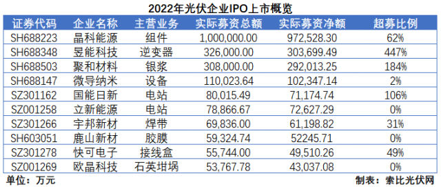2022年,A股市場共有10家光伏企業(yè)完成IPO并成功上市,募資總額達到214.16億元,占A股市場5870億募資總額的比重為3.65%。值得一提的是,晶科能源募資總額高達100億元,是A股市場中僅有的五家達到百億級別的企業(yè)。此外,受益于廣闊的發(fā)展前景,機構(gòu)投資者對于光伏企業(yè)也頗為“慷慨”,像昱能科技、聚和材料超募比例分別達到447%和184%。