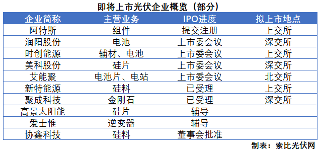已經(jīng)到來的2023年,A股市場還將迎來更多重量級的光伏企業(yè)。其中,全球組件龍頭阿特斯已提交注冊,電池片“龍三”潤陽股份、硅片新勢力美科股份已成功通過上市委會議,硅料巨頭新特能源已獲受理。此外,協(xié)鑫科技、高景太陽能也已經(jīng)分別獲得董事會批準和進入輔導期。
