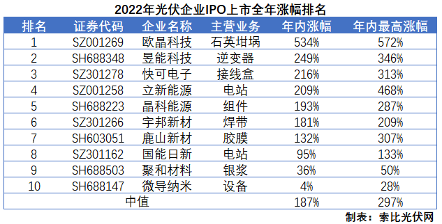 企業(yè)超募、股價暴漲、股民暴賺,這就是2022年成功登陸A股市場的10家光伏企業(yè)交出的“答卷”。而2023年,阿特斯、潤陽股份、美科股份、新特能源等一眾龍頭和新貴,也即將登陸A股市場。