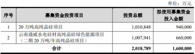 根據(jù)該方案,本次募資資金將用于兩大投資項目:一是20萬噸高純晶硅項目,擬投入募資額94億元(總投資將達(dá)101.0848億元);二是云南通威水電硅材高純晶硅綠色能源項目(二期20萬噸/年高純晶硅項目),擬投入募資額66億元(總投資將達(dá)100.7941億元)。