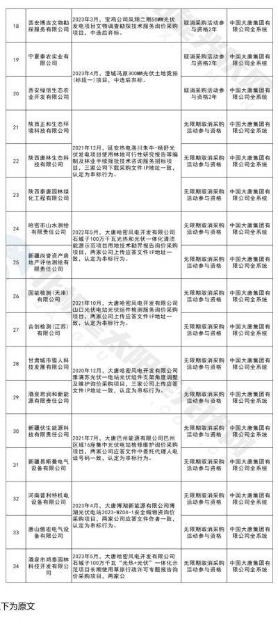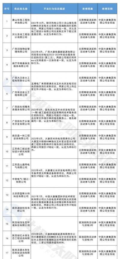 根據(jù)統(tǒng)計(jì),共有34個(gè)光伏相關(guān)企業(yè),17個(gè)光伏項(xiàng)目不良行為被大唐集團(tuán)處理,通知表示,相關(guān)供應(yīng)商可在上述處理期結(jié)束前1個(gè)月,向招標(biāo)人提出整改驗(yàn)收申請(qǐng),經(jīng)相關(guān)單位或部門(mén)驗(yàn)收合格后方能解除處理。