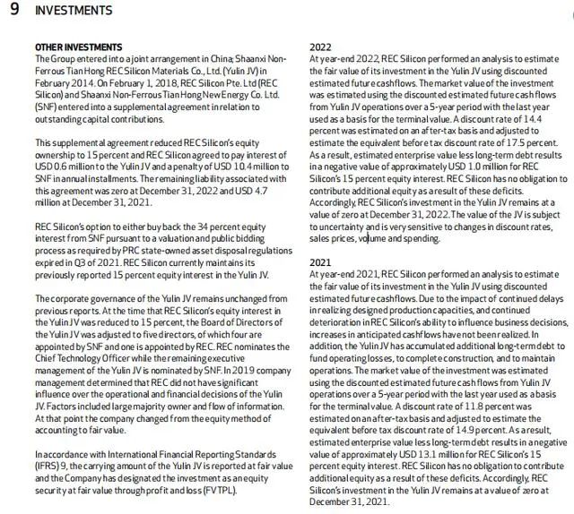 而REC硅披露了其參與公司運(yùn)營情況。根據(jù)年報(bào),REC硅通過分析估算得出,天宏瑞科的企業(yè)價(jià)值減去長期債務(wù)后,REC硅所持15%的股權(quán)價(jià)值在2021年約為負(fù)1310萬美元,2022年則為負(fù)100萬美元,REC稱自己沒有必要再為此赤字進(jìn)行額外股本投資。