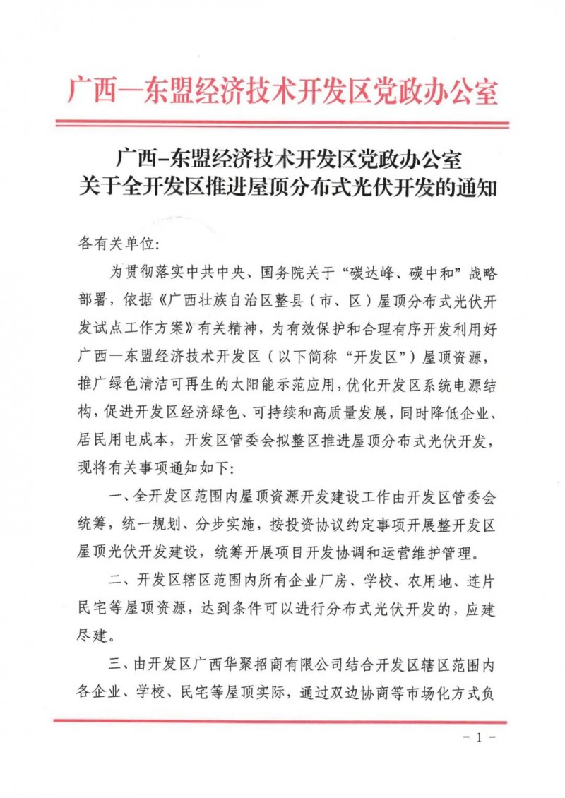 廣西-東盟經(jīng)濟(jì)技術(shù)開發(fā)區(qū)黨政辦公室發(fā)布關(guān)于全開發(fā)區(qū)推進(jìn)屋頂分布式光伏開發(fā)的通知。