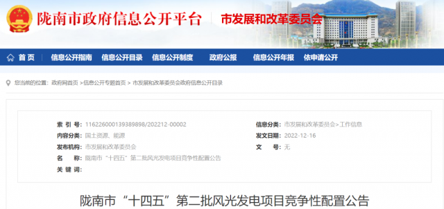 12月16日,隴南市發(fā)布“十四五”第二批風光發(fā)電項目競爭性配置公告。