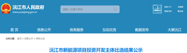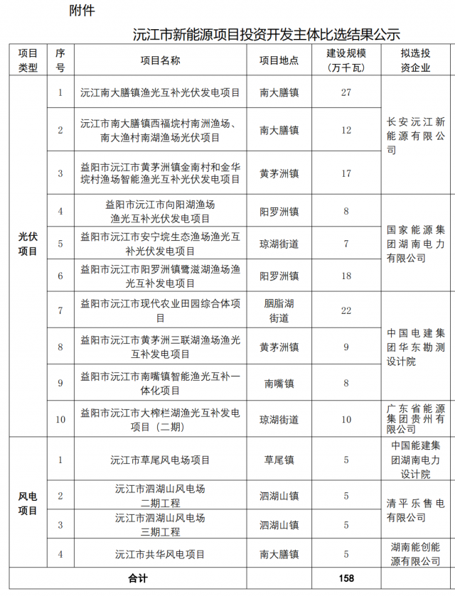 2月17日,湖南省沅江市人民政府下發(fā)《沅江市新能源項目投資開發(fā)主體比選結(jié)果公示》,共下發(fā)了1.58GW,包含1.38GW光伏項目、0.2GW風電項目。