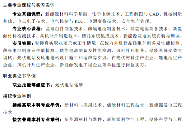 在中等職業(yè)教育中,包括光伏工程技術(shù)與應(yīng)用專業(yè)、太陽能與沼氣技術(shù)利用兩個(gè)專業(yè)。高等職業(yè)教育??茖I(yè)中,包括光伏工程技術(shù)、新能源材料應(yīng)用技術(shù)兩個(gè)專業(yè)。高等職業(yè)教育本科專業(yè)中僅有新能源材料應(yīng)用技術(shù)一個(gè)相關(guān)專業(yè)。