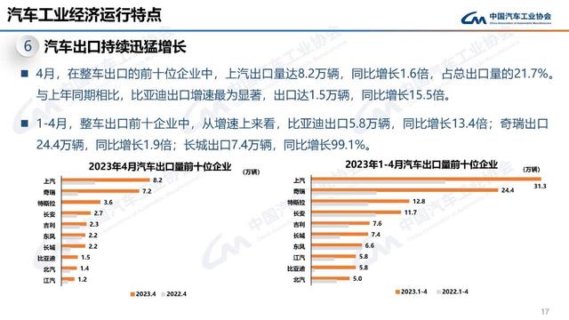 六是汽車出口持續(xù)迅猛增長。4月,汽車企業(yè)出口37.6萬輛,環(huán)比增長3.3%,同比增長1.7倍。分車型看,乘用車本月出口31.6萬輛,環(huán)比增長3.7%,同比增長2.2倍,商用車出口6萬輛,環(huán)比增長1.2%,同比增長41.6%。新能源汽車出口10萬輛,環(huán)比增長28.6%,同比增長8.4倍。