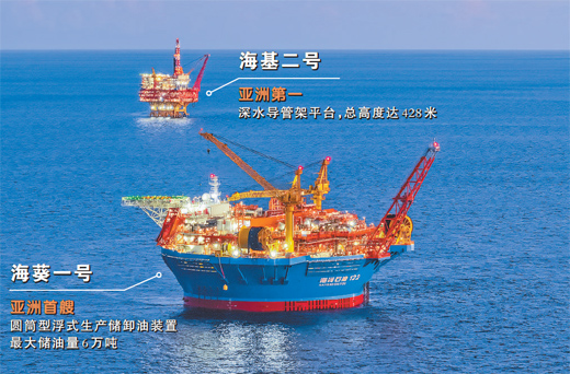 這一天,兩個“能源重器”——亞洲首艘圓筒型浮式生產(chǎn)儲卸油裝置(FPSO)“??惶?rdquo;、亞洲第一深水導(dǎo)管架平臺“海基二號”攜手上崗,標(biāo)志著我國全類型深水油氣裝備的設(shè)計、建造和安裝能力達(dá)到世界一流水平。