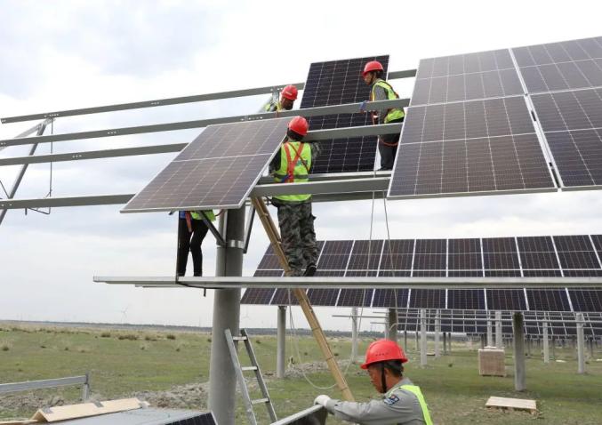 7月11日,在張家口市康保縣張紀(jì)鎮(zhèn),工人在一處光伏發(fā)電場(chǎng)建設(shè)工地施工。新華社記者 楊世堯 攝