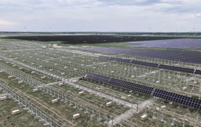 這是張家口市康??h張紀(jì)鎮(zhèn)一處施工中的光伏發(fā)電場(chǎng)(7月11日攝,無(wú)人機(jī)照片)。