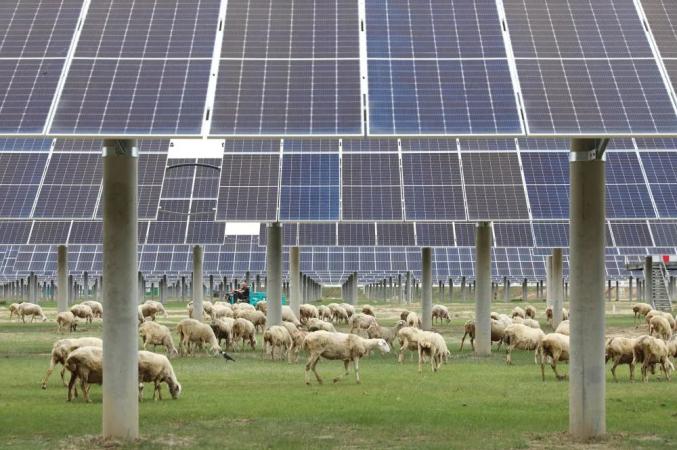 7月11日,在張家口市康??h張紀(jì)鎮(zhèn),羊群在光伏板下覓食。新華社記者 楊世堯 攝