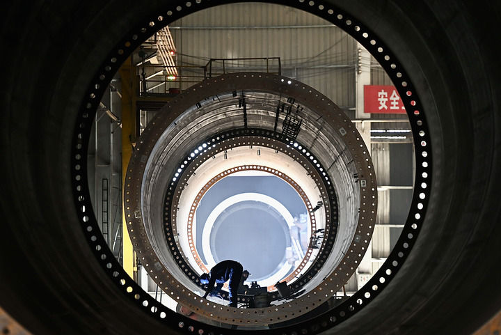 2024年4月23日,新疆木壘哈薩克自治縣民生工業(yè)園區(qū)木壘泰勝風(fēng)能裝備有限公司工人在生產(chǎn)線上生產(chǎn)風(fēng)力發(fā)電機塔筒