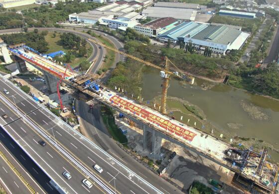 全長142.3公里的雅萬高鐵,正線80%以上設(shè)計為橋梁,其中大多數(shù)采用標(biāo)準(zhǔn)的預(yù)制箱梁連接。在跨越既有的公路、鐵路和河流等障礙的線路上,不少橋梁段采用了現(xiàn)澆工藝的連續(xù)梁施工。由水電八局承建的2號特大橋全長36公里,就有25處設(shè)計采用連續(xù)梁形式跨越立交橋、高速公路互通匝道及河流。這里的連續(xù)梁密度之高,施工難度之大,高鐵建筑史上罕見。因此,連續(xù)梁施工成為水電八局管段內(nèi)最重要的施工內(nèi)容之一。